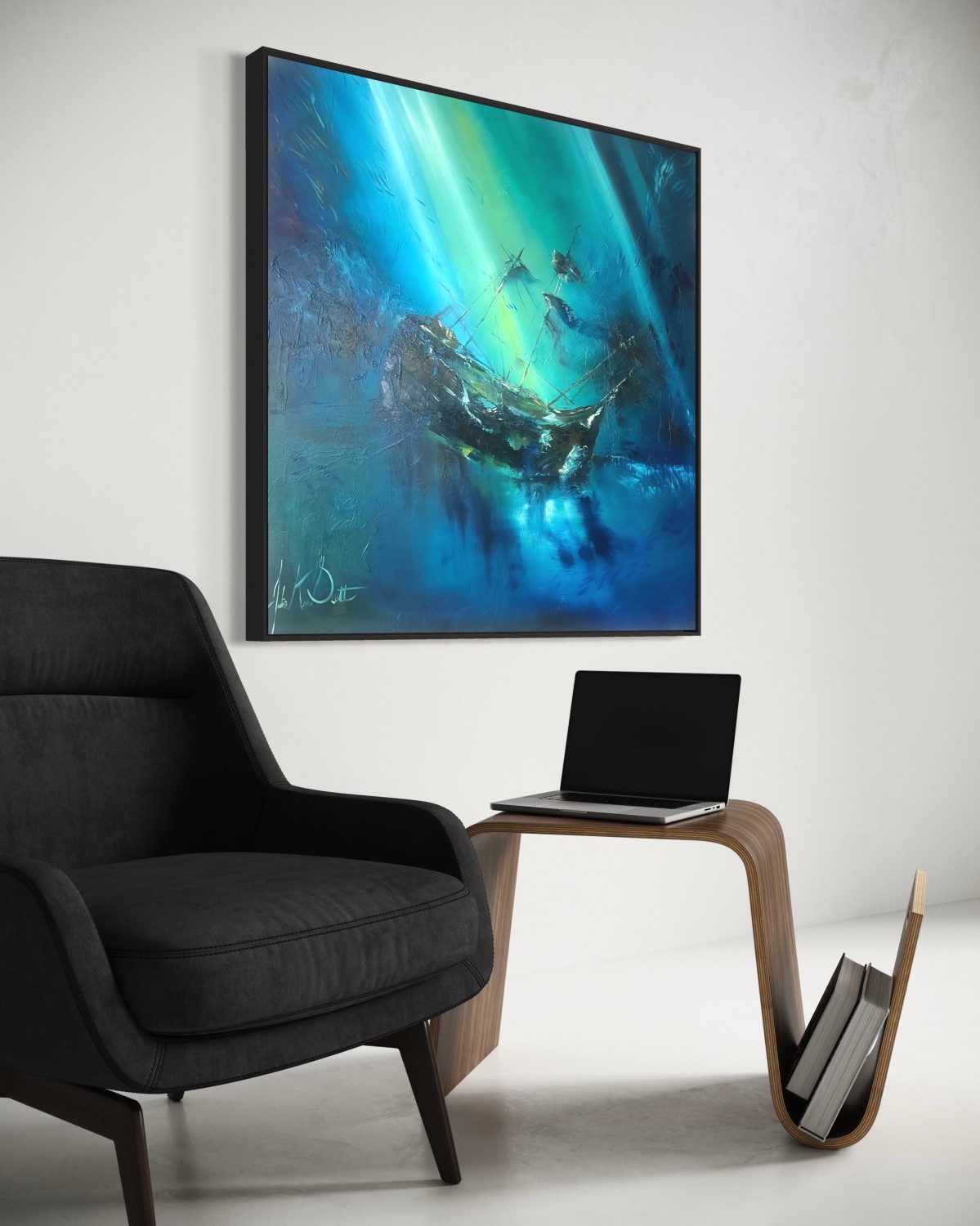 Julie Ann’s signature oil paintings feature turtles, koi, and coastal vistas, capturing the light, movement, and beauty of nature. These pieces invite viewers into a tranquil yet immersive experience of the natural world.