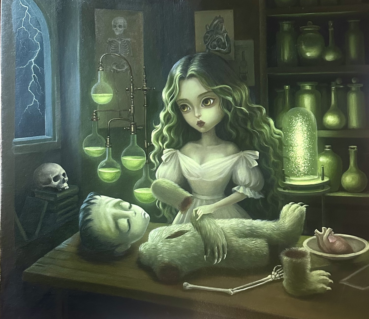 In Echo of Life, Xue Wang delves into the timeless themes of creation, transformation, and identity — the same questions that haunted Shelley’s original Frankenstein. One of the standout works in the exhibition, “Furankenstein”, reimagines the iconic tale through Wang’s distinct lens of surrealist pop-realism. With her porcelain-skinned figures, playful anthropomorphism, and darkly whimsical details, Wang captures the tension between innocence and monstrosity, humour and melancholy, that has always defined Shelley’s myth.